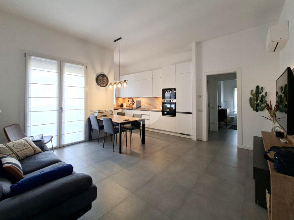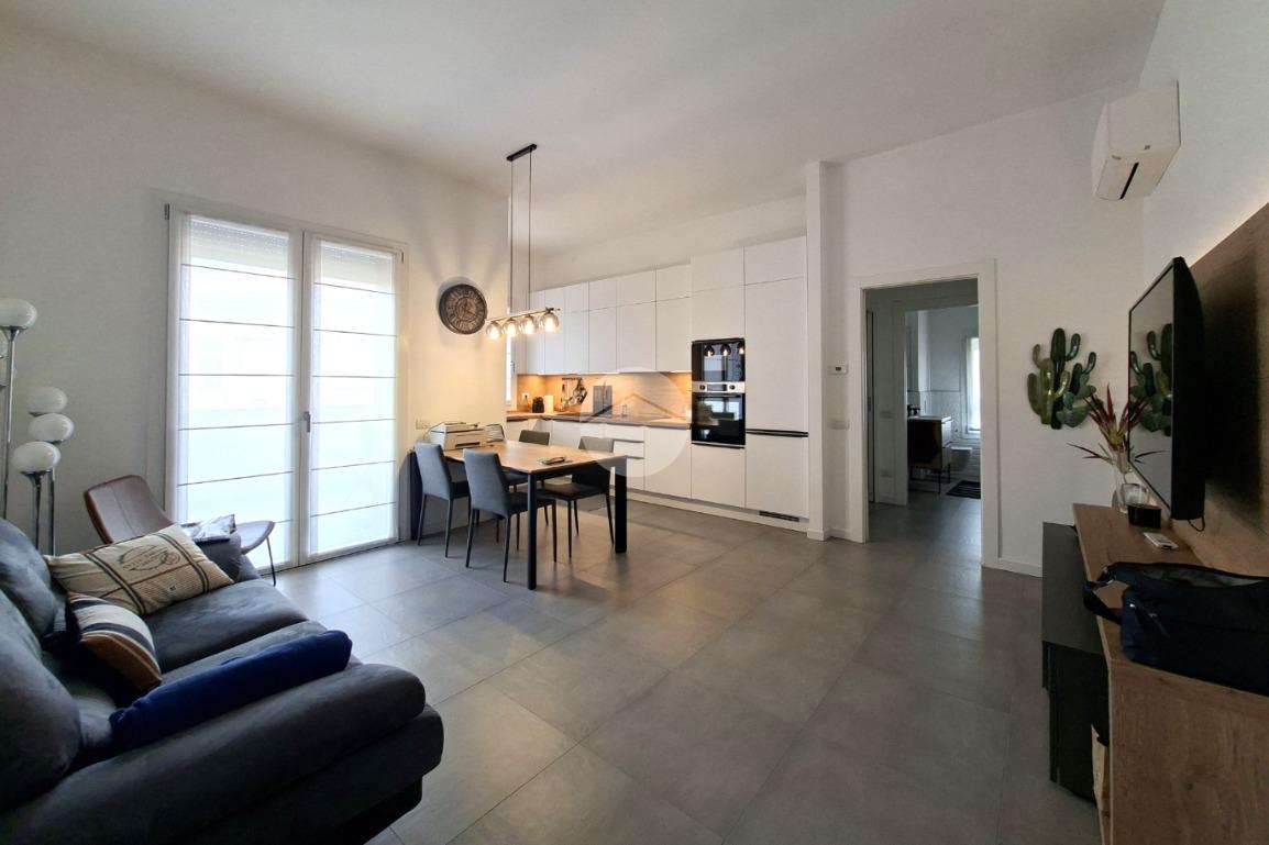 Zona giorno living con pratico angolo cottura mantenuto a vista e servita da strutturabile terrazzo.